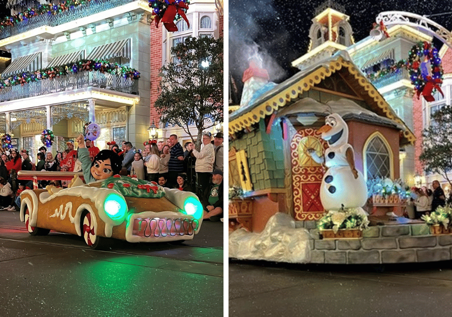 One of the most dazzling moments of the evening is Frozen Holiday Surprise, where Elsa, Anna, Olaf, Kristoff, and the snowgies gather at Cinderella Castle to transform it into a sparkling frozen wonderland. It’s a beautiful, can’t-miss show that brings Arendelle’s magic to life in the heart of Magic Kingdom.