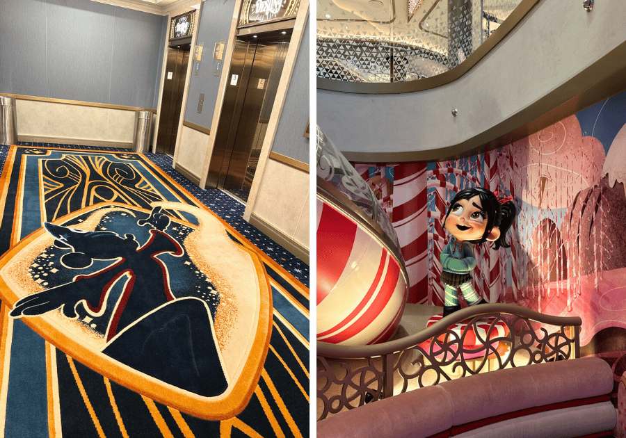 If you’ve been on a Disney ship before, you know the details love to show off. Even just by walking down the hallways toward my stateroom, I found myself slowing down to catch little things: the Pegasus silhouettes glowing in the hallway lights, the surprisingly bright and uplifting colors, and even the whimsical door hooks added charming touches to each stateroom; no detail was overlooked.