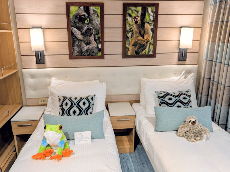 We shared a Category 4 stateroom, and it ended up being a surprisingly comfortable home base for two people. The room featured two single beds that could convert to a queen, a small desk and chair, reading lights, ample shelving, drawers, and space under the beds for luggage.