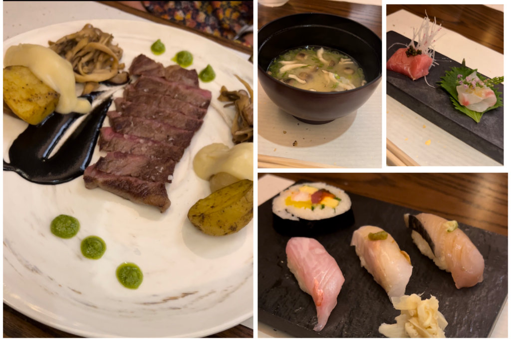The Yakimono course gave us a choice of three different entrees. I chose the roasted duck with garlic sautéed spinach, pumpkin puree, and black grape reduction. This came in a smoke-filled dome which infused the whole dish with a savory flavor. I wasn’t surprised at all that my husband chose the Japanese A5 wagyu steak with curry-roasted potatoes, roasted seasonal mushrooms, and a black garlic sauce. We shared both dishes, and we both preferred the steak, but the duck was also very tasty and tender as well.
