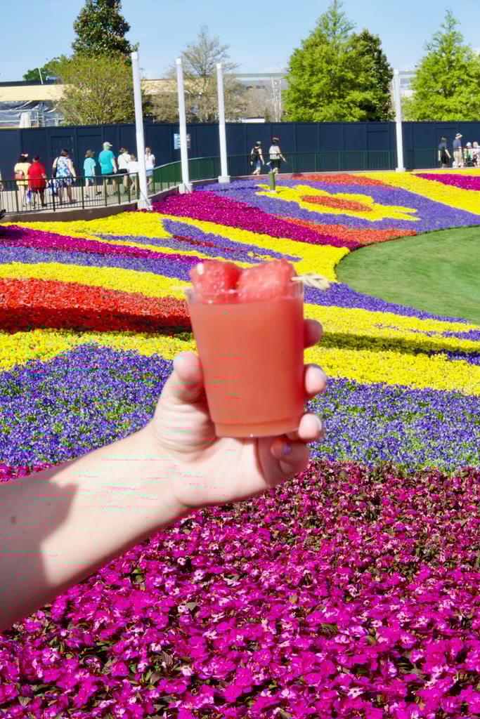This refreshing slush at the Florida Fresh booth comes in both a non-alcoholic and a boozy version. My toddler is at the age where you want to eat and drink the same thing mommy does – so I was able to purchase her a kid-friendly version of my beverage, which made her so happy. The cucumber and watermelon combination is both refreshing, tart, and not too sweet. My favorite part of this booth is that it’s located near the sweeping patchwork covering of flowers that the monorail runs over, giving you some incredible views while you enjoy your cold beverage.